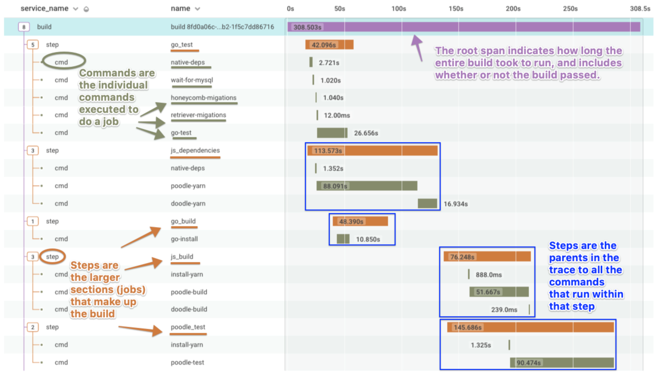 Generated traces contain spans for each section and subsection of the build, with each span representing individual or groups of actual commands that are executed. The duration of each span is how long that stage or specific command took to run. Each span also contains data such as whether or not the command succeeded and any additional data you choose to capture. When your build concludes, this integration ensures your trace is sent to Honeycomb.