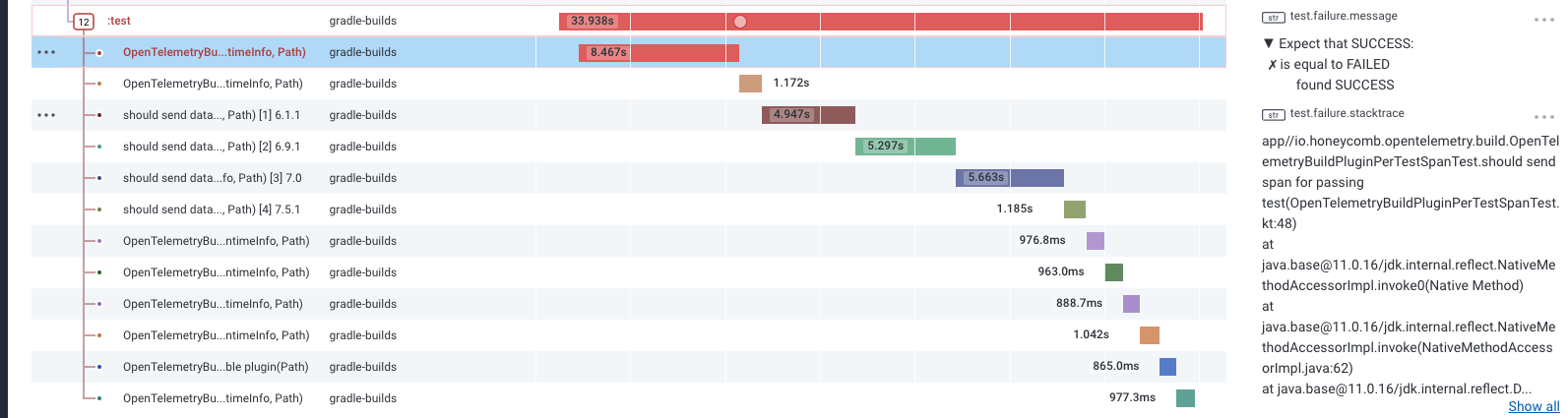 This trace shows you the waterfall of test case executions—when each test started and finished. You can see the tests are running serially: using Gradle’s test parallelization capabilities could speed up this build.